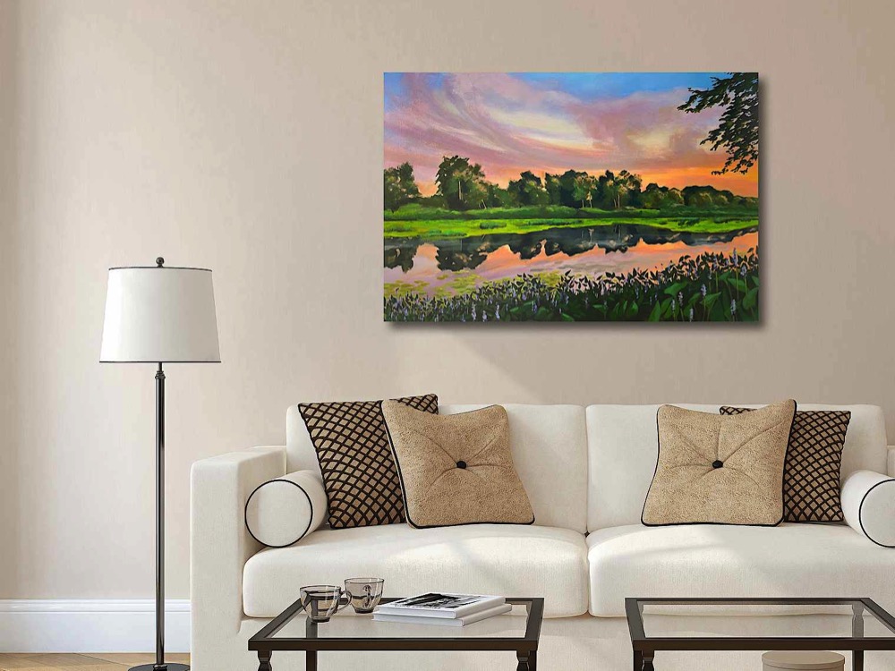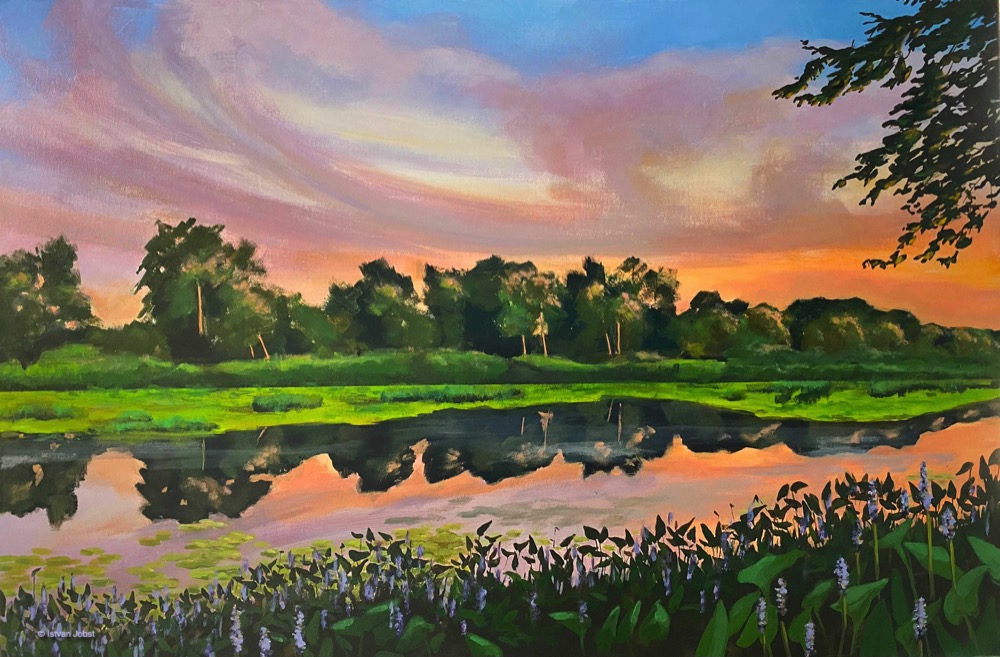 I go down to Petrie Island from time to time, enjoying the bit of wild in the city and collecting inspiration and reference photos. I have not been there in the evening, so when I saw the photos from July 22 by Greg Scriver , I was captivated by the beautiful subtle colours and peaceful evening scene. I asked Greg for permission to use his pic as a reference for a piece I imagined and he generously agreed.
