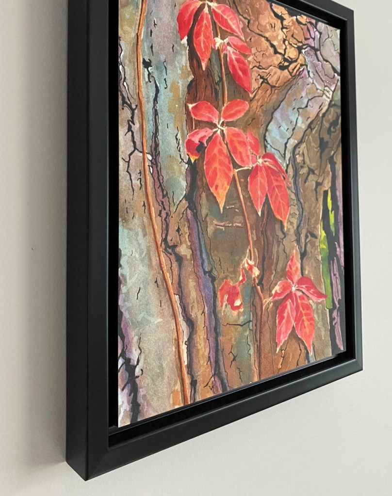 Autumn Vine – Acrylic Ink / Watercolour, 14×11 on 140 lb Watercolour Paper on 1 inch cradled board, with black floater frame $210