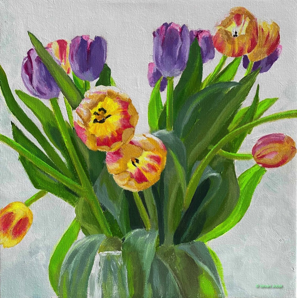 Tulips 2 – Acrylic, 12×12 on gallery canvas – $160