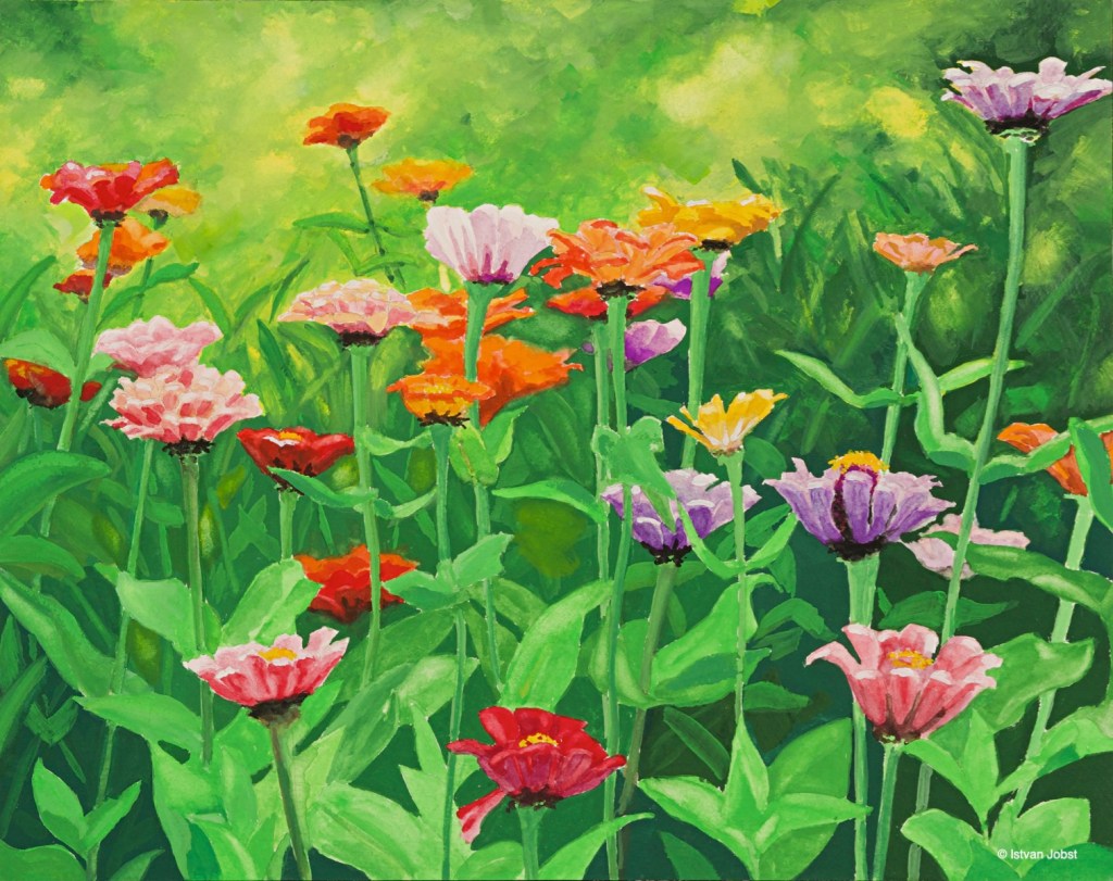 Zinnias – Guoache, 11×14 on 140 lb watercolour paper mounted on gallery cradled board
